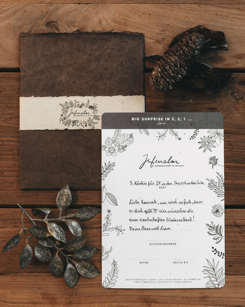 Die schönsten Geschenke sind jene, die wir am liebsten selbst behalten würden. Geschenke, die schon von außen bezaubern und im Inneren noch wertvoller werden. Mit einem Jufenalm-Gutschein schenken Sie mehr als nur ein Präsent – Sie verschenken eine Auszeit in den Bergen, voll Ruhe, Genuss und Boho-Spirit.